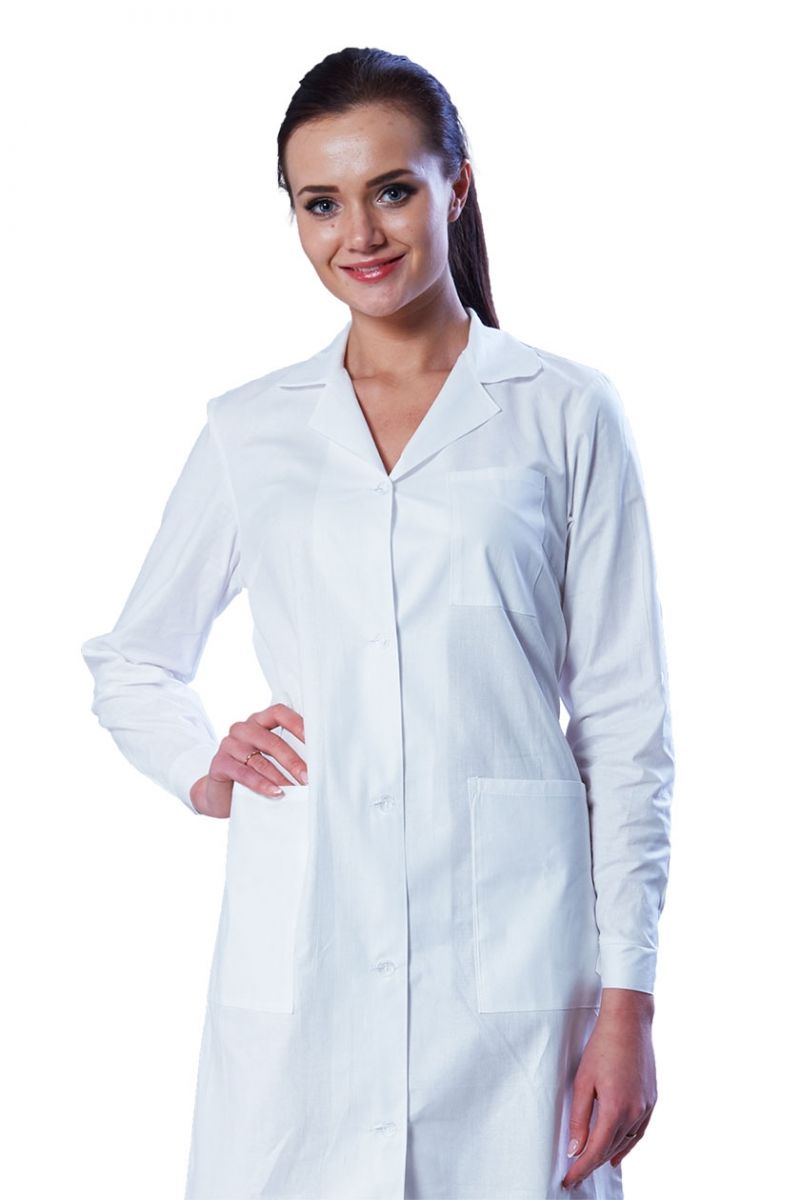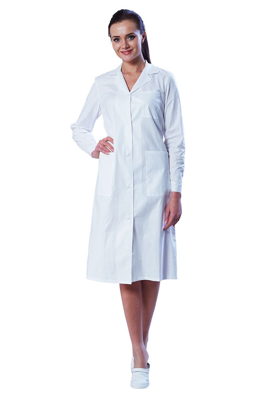 Халат с центральной бортовой застежкой на пуговицы. На женском халате предусмотрены нагрудные вытачки на полочках. Один нагрудным и два нижних накладных кармана.