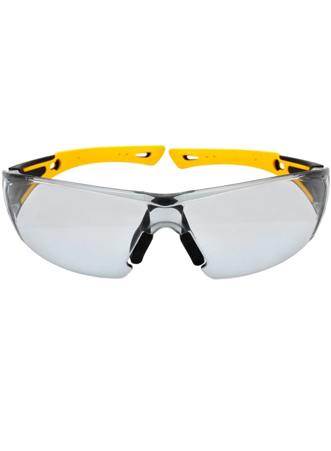Панорамные затемненные линзы, два уровня защиты: фронтальный, боковой. Дужки двухцветные из тэрмоэластопласта (ТЭП). На переносице и заушниках мягкий, тактильно-приятный материал.