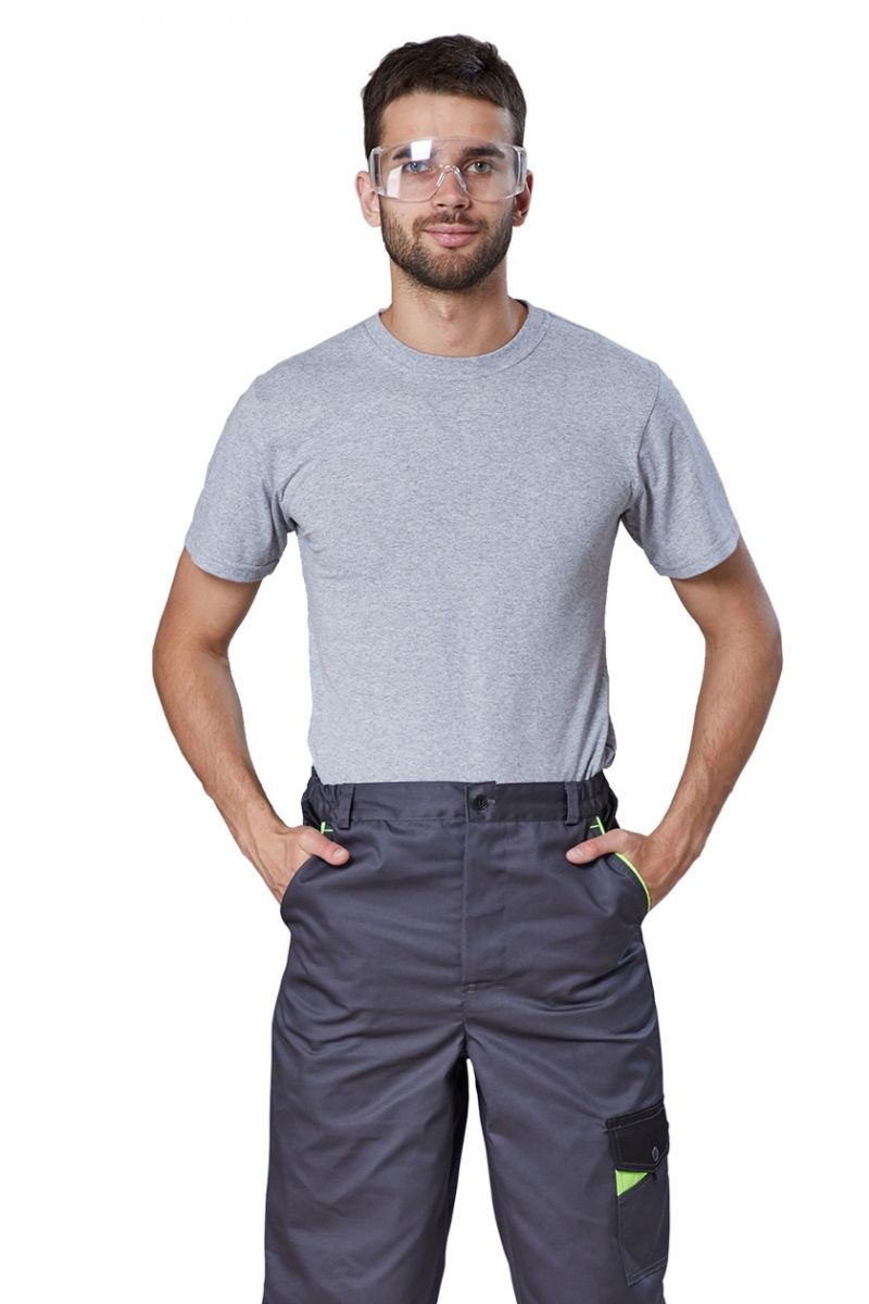 Брюки мужские прямого кроя, с застёжкой гульфика на молнию. Притачной пояс с резинкой по бокам и шлевками. Накладные карманы на левом боковом шве с клапаном с патой на кнопке. Два задних накладных кармана и карман для инструментов.