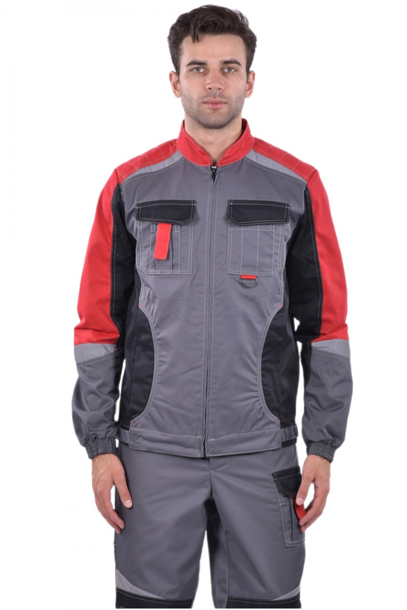 ➠ Куртка: цвет серый с красной и черной отделкой, силуэт прямой, пояс притачной, застежка на молнию, воротник стойка. Накладные карманы комбинированные с малыми накладными карманами с разделителями. Прорезные карманы на нижней части полочки. По шву притачивания кокетки вверху и по рукавам фигурные вставки СОП.