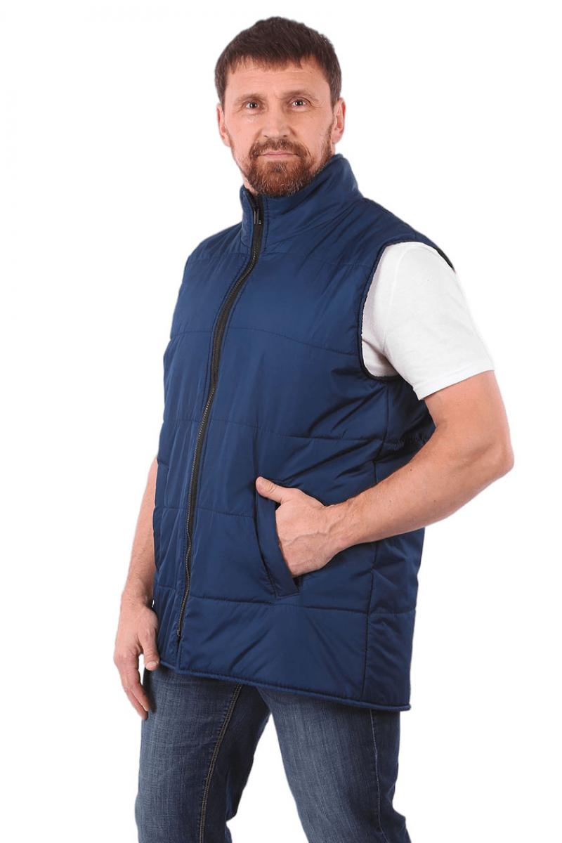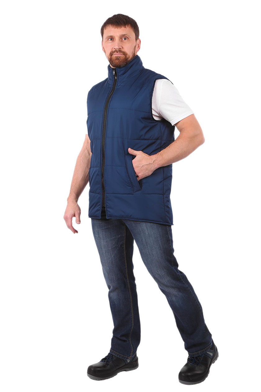 Жилет прямого силуэта, с центральной застежкой на тесьму «молния». Два нижних прорезных кармана с наклонным входом.