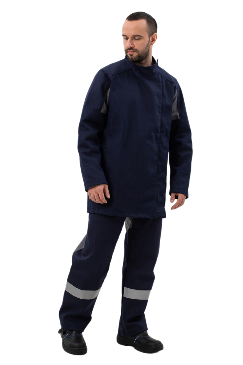 Оптимальный объем костюма исключает излишние заломы ткани и попадание в них искр и брызг. Отделочные строчки выполнены огнестойкими нитками.