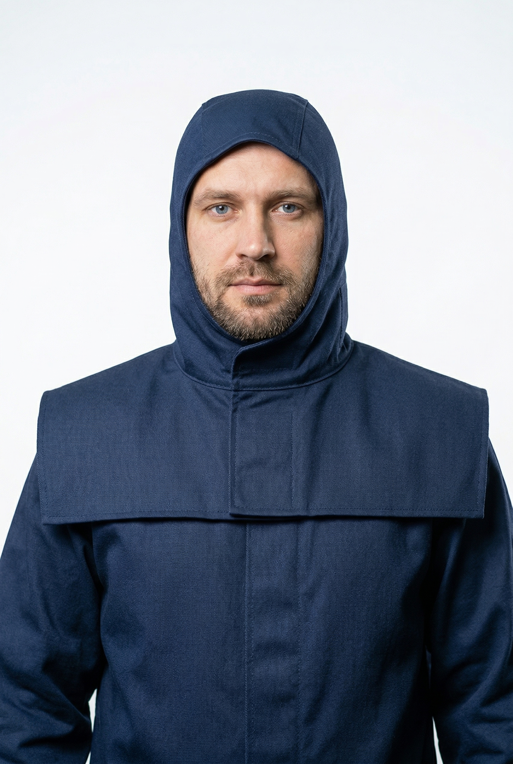 Объем головы регулируется с помощью паты. Пелерина обеспечивает дополниельную защиты плеч, застегивается на липкую ленту.